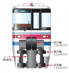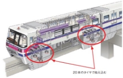 1両あたり(2台車)20本のタイヤが軌道を抱え込むように配置されており、構造上、脱線することはありません。