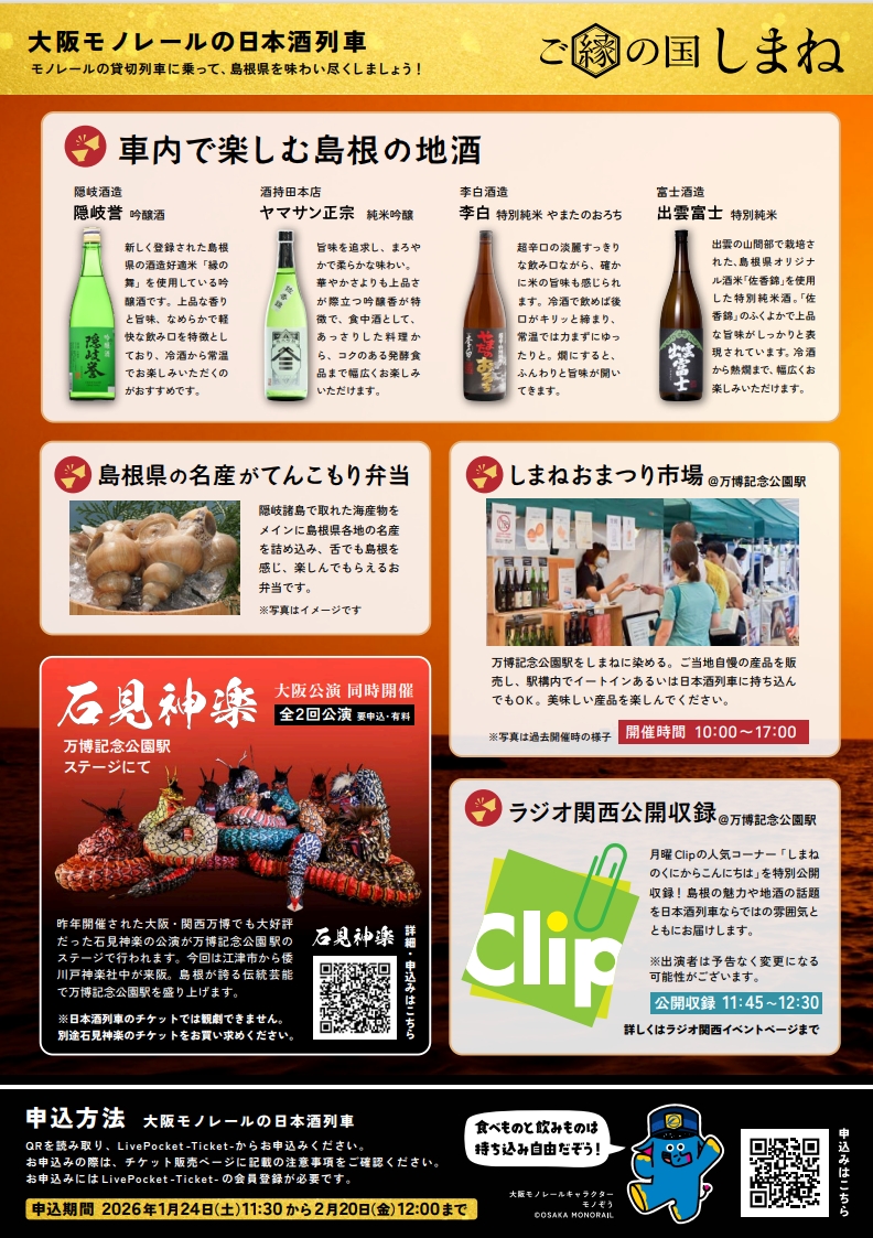 万博記念公園駅では、ラジオ関西「月曜Clip」の人気コーナー「しまねのくにからこんにちは」を特別公開収録!島根の魅力や地酒の話題を日本酒列車ならではの雰囲気とともにお届けします。※出演者は予告なく変更になる可能性がございます。