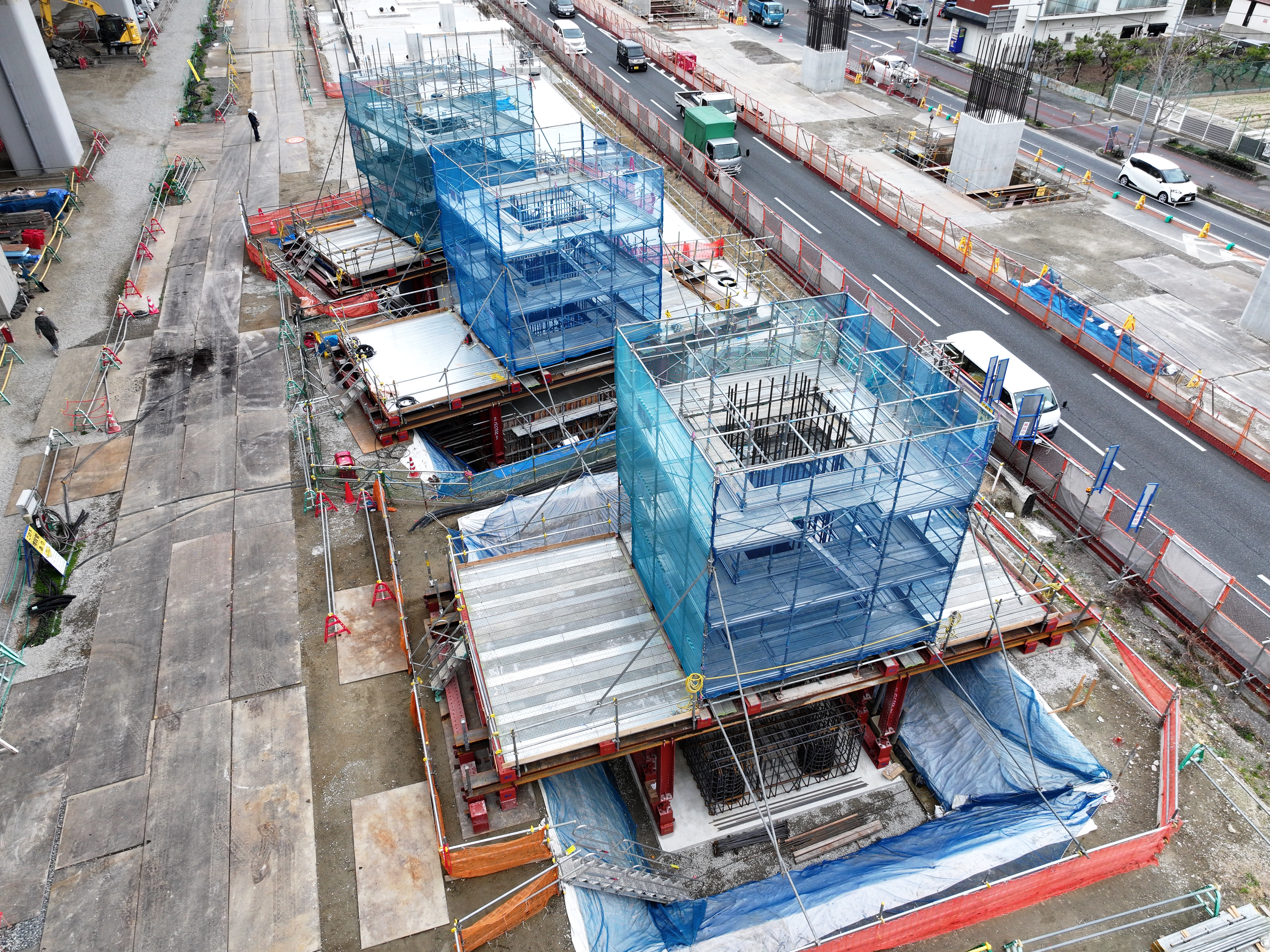 敷地中央部では、入出庫線のRC支柱について引き続き工事を進めており、現在8本が施工中です。
