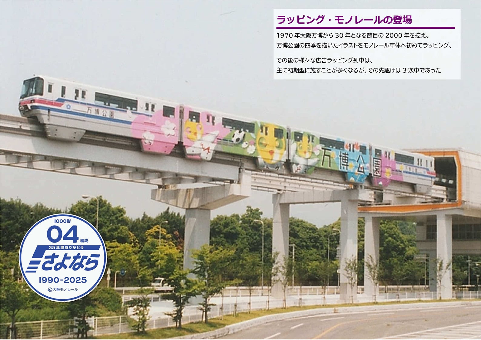 大阪モノレールは、市街地の幹線道路上空を走る特徴を活かして、車体外板にシール塗装を施した車体広告列車を走らせています。