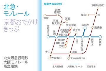北急・モノレール 京都おでかけきっぷは、大阪モノレール全線、北大阪急行全線、阪急電車の宝塚線および京都線(箕面・千里・嵐山の各支線を含む)が1日乗り放題になります。さらに、嵐山・万博記念公園エリアの施設や店舗などでご利用いただけるご優待特典もついています。