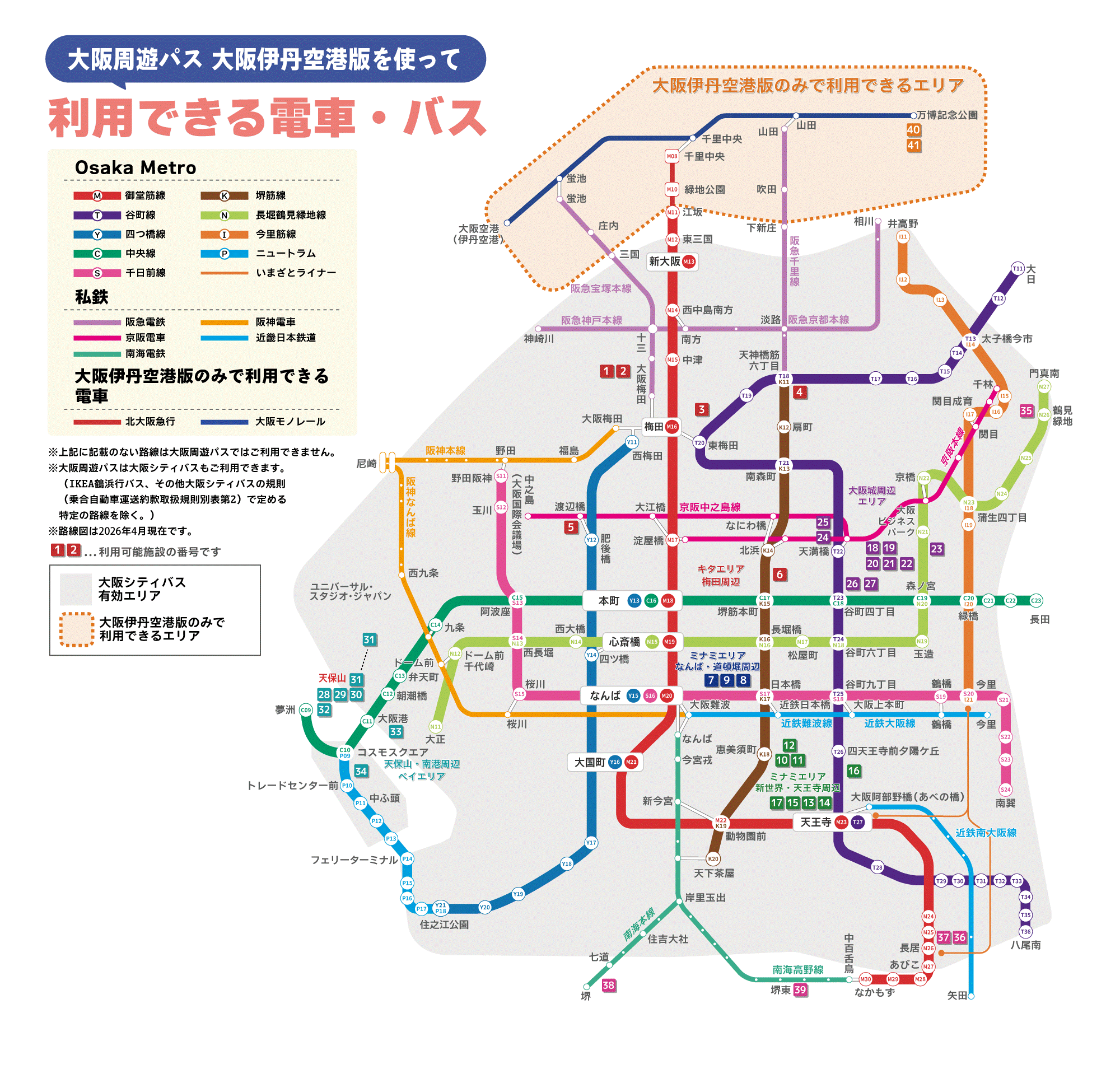 エリア拡大版「スルッとKANSAI 大阪周遊パス1day 大阪伊丹空港版」「スルッとKANSAI 大阪周遊パス2day 大阪伊丹空港版」は、通常の大阪市エリア乗り放題に加え、大阪空港からのアクセス・万博記念公園周辺での特典およびアクセスも含まれます。